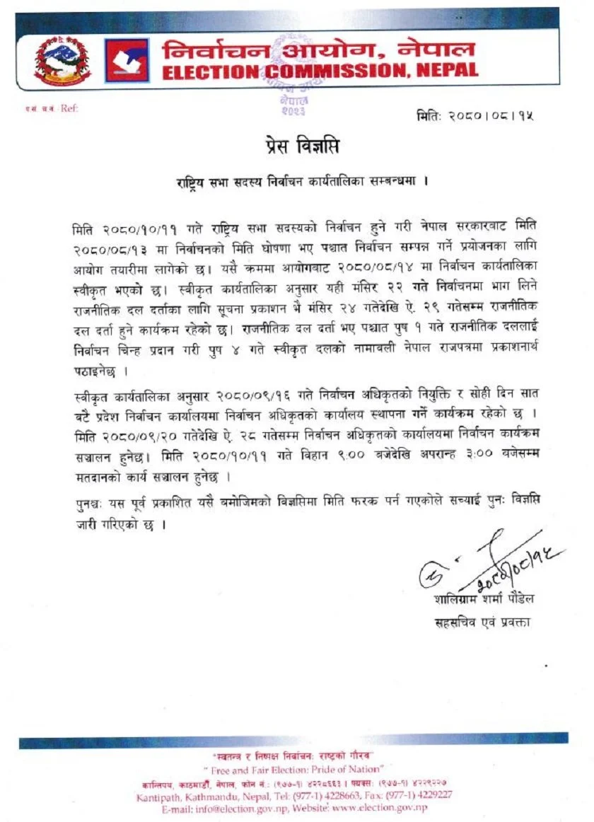 पुस २० देखि २८ गतेसम्म निर्वाचन अधिकृतको कार्यालयमा निर्वाचन कार्यक्रम सञ्चालन हुनेछ। सरकारले यही मङ्सिर १३ गते निर्वाचनको मिति घोषणा गरेको थियो।