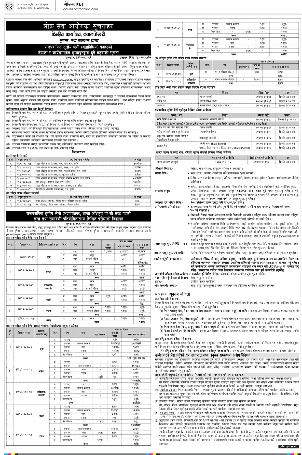 आयोगले २७३ जना अधिकृत नियुक्त गर्न खुला तथा समावेशी प्रतियोगितात्मक लिखित परीक्षाका लागि आवेदन मागेको छ। निजामतीतर्फका सामान्य प्रशासन, राजस्व, लेखा, लेखापरीक्षण, परराष्ट्र समूहमा २०३ जना, न्याय सेवा (न्याय, कानून र सरकारी वकिल समूह) तर्फ ६८ जना र मावअधिकार सेवातर्फ २ जना अधिकृत माग गरेको हो। १७ पुससम्म अनलाइनमार्फत दरखास्त दिने अन्तिम मिति तोकिएको छ। २४ पुससम्म दोब्बर दस्तुर तिरेर दरखास्त दिन सकिने छ।