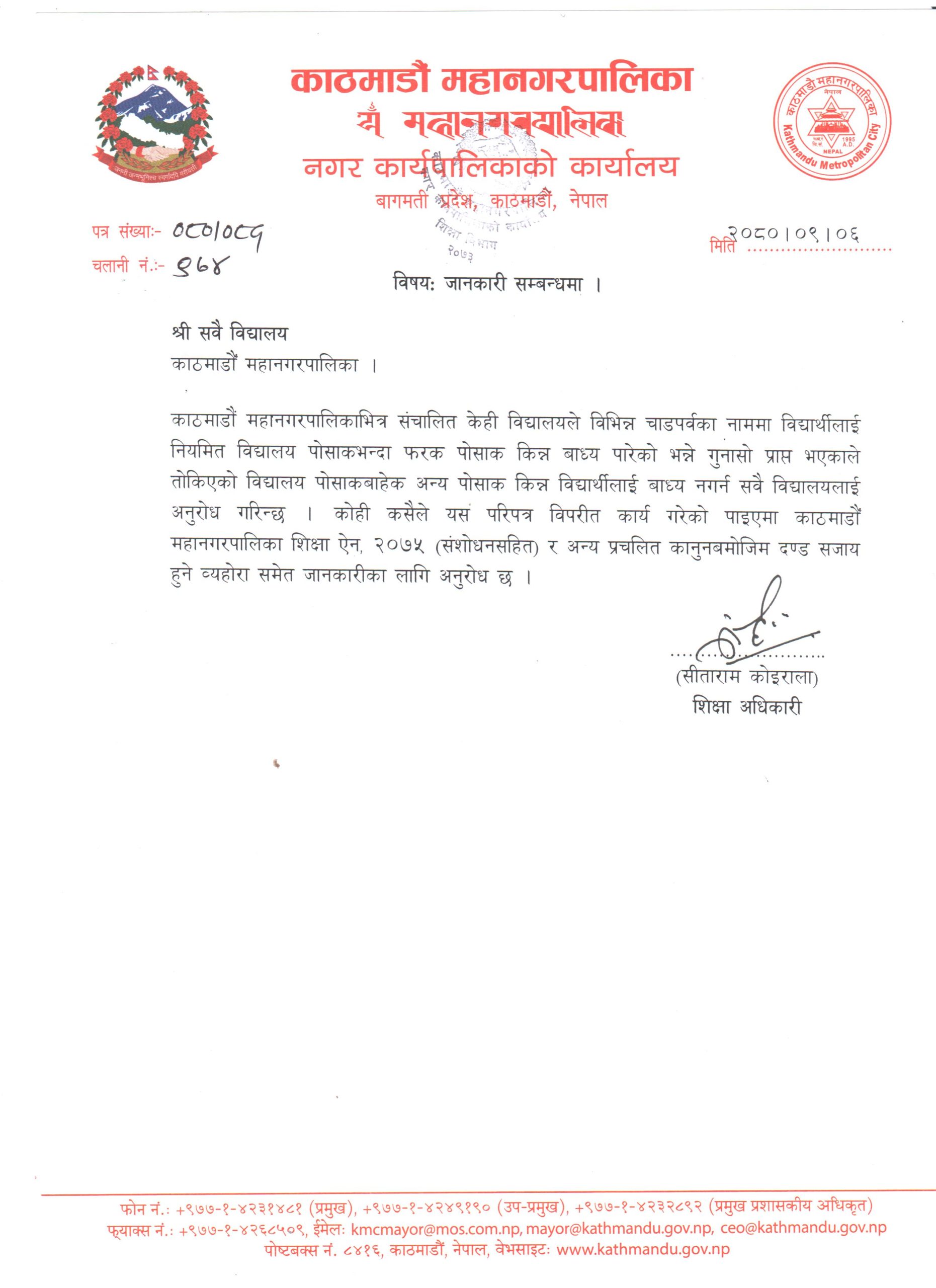 महानगरका शिक्षा अधिकारी सीताराम कोइरालाले शुक्रबार सबै विद्यालयलाई गरेको परिपत्रमा नियमित विद्यालय पोसाकभन्दा फरक-फरक पोसाक किन्न बाध्य पारेमा कारबाही गर्ने चेतावनी दिएका छन्। परिपत्रविपरीत कार्य गरे विद्यालयलाई कानुनअनुसार कारबाही गरिने उनको भनाइ छ।