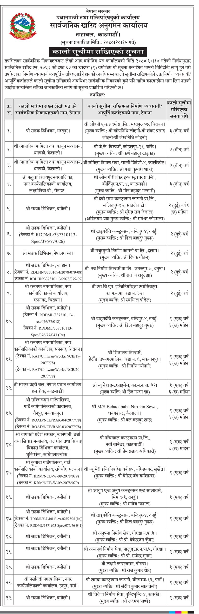कालोसूचीमा परेका आपूर्तिकर्ताहरुमा श्री लोहनी एण्ड ब्रदर्स प्रालि चितवन, श्री जे.जे. विल्डर्स बाँके, श्री सर्मिला निर्माण सेवा, कालीकोट, श्री ओम गौरीशंकर इन्फास्ट्रक्चर प्राली लगायत छन्। ती कम्पनीहरूलाई न्यूनतम ६ महिनादेखि ३ वर्षसम्म कालोसूचीमा राखिने उल्लेख गरिएको छ।