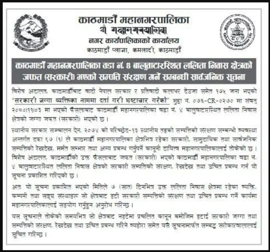 महानगरले सूचना प्रकाशित गर्दै ७ दिनको अवधि दिएर सार्वजनिक सम्पत्तिको संरक्षण गर्न सहयोगका लागि अनुरोध गरेको छ। ‘विशेष अदालत, काठमाडौँबाट वादी नेपाल सरकार र प्रतिवादी कलाधर देउजासमेत १७५ जना भएको सरकारी जग्गा व्यक्तिका नाममा दर्ता गरी भ्रष्टाचार गरेको मुद्दामा २०८० फागुन ३ गते भएको फैसलाबाट काठमाडौँ महानगरपालिका वडा नं.४ बालुवाटारस्थित ललिता निवास क्षेत्रको जग्गा जफत (सरकारी) भएको छ,’ सूचनामा भनिएको छ, ‘स्थानीय सरकार सञ्चालन ऐन, २०७४ को परिच्छेद–१३ स्थानीय तहको सम्पत्तिको संरक्षण सम्बन्धी व्यवस्थाअन्तर्गत दफा ९७ (१) ले काठमाडौँ महानगरपालिका क्षेत्रभित्र रहेका सरकारी, सामुदायिक तथा सार्वजनिक सम्पत्तिको रेखदेख, मर्मत संभार तथा अन्य प्रबन्ध गर्नुपर्ने कानुनी दायित्व महानगरपालिकालाई तोकेको छ । विशेष अदालत, काठमाडौँको उक्त फैसलाबाट जफत (सरकारी) भएको काठमाडौँ महानगरपालिका वडा नं.४ बालुवाटारस्थित ललिता निवास क्षेत्रको सरकारी सम्पत्तिको संरक्षण, रेखदेख तथा उचित प्रबन्ध गर्न यो सूचना प्रकाशित गरिएको छ।’