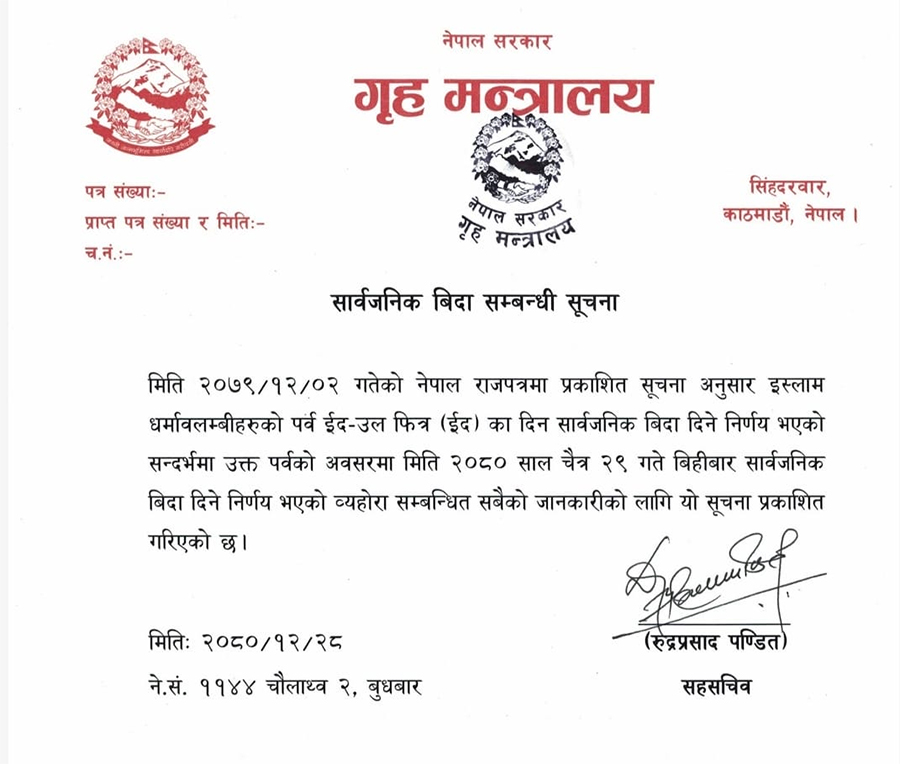 इस्लाम धर्मावलम्बीहरुको पर्व इदउल फित्रको अवसरमा सार्वजनिक बिदा दिइएको गृह मन्त्रालयले जनाएको छ।