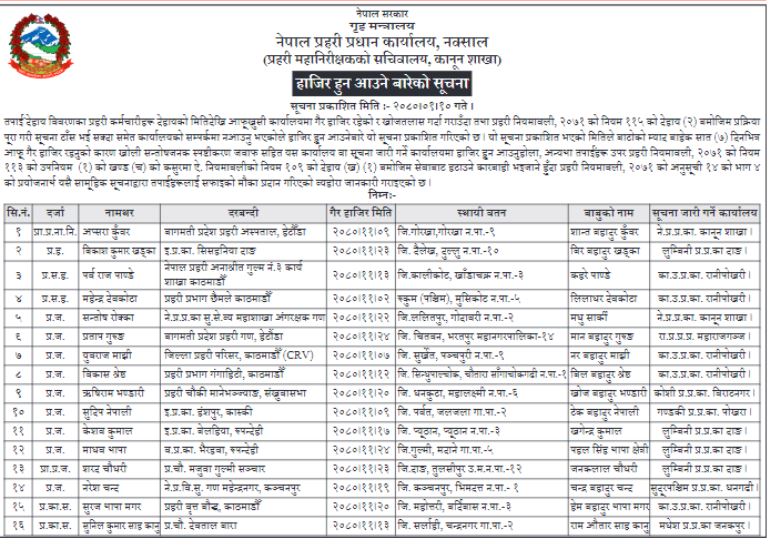 कार्यालयले सोमबार सूचना जारी गरी विभिन्न पदमा कार्यरत प्रहरीलाई सम्पर्कमा आउन भनेकको हो। गैरहाजिरीमा रहनुको स्पष्ट र सन्तोषजनक स्पष्टीकरणसहित प्रहरी प्रधान कार्यालयमा हाजिर हुन र अन्यथा सेवाबाट हटाएर कारवाही गरिने सूचनामा उल्लेख छ।