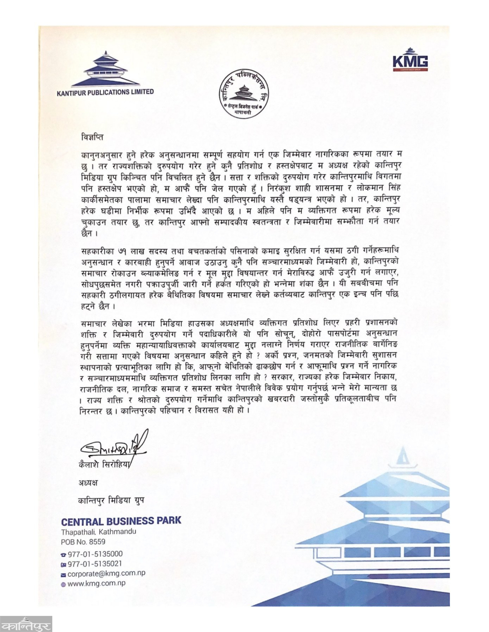‘कानुनअनुसार हुने हरेक अनुसन्धानमा सम्पूर्ण सहयोग गर्न एक जिम्मेवार नागरिकका रूपमा तयार म छु,’ सिरोहियाले भनेका छन्, ‘तर, राज्यशक्तिको दुरुपयोग गरेर हुने कुनै प्रतिशोध र हस्तक्षेपबाट म अध्यक्ष रहेको कान्तिपुर मिडिया ग्रुप किञ्चित पनि विचलित हुने छैन।’