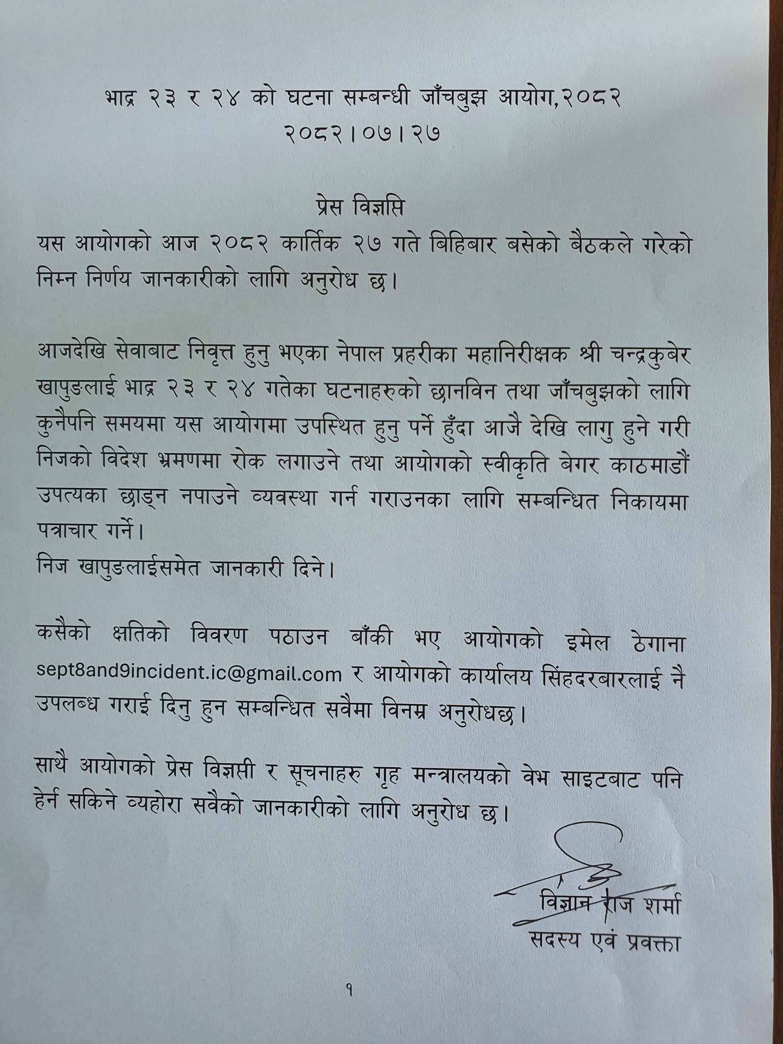 काठमाडौं- निवर्तमान आईजीपी चन्द्रकुबेर खापुङलाई विदेश भ्रमणमा रोक लगाउने गरी जेनजी घटनाको छानबिन तथा जाँचबुझ आयोगले पत्राचार गरेको छ।